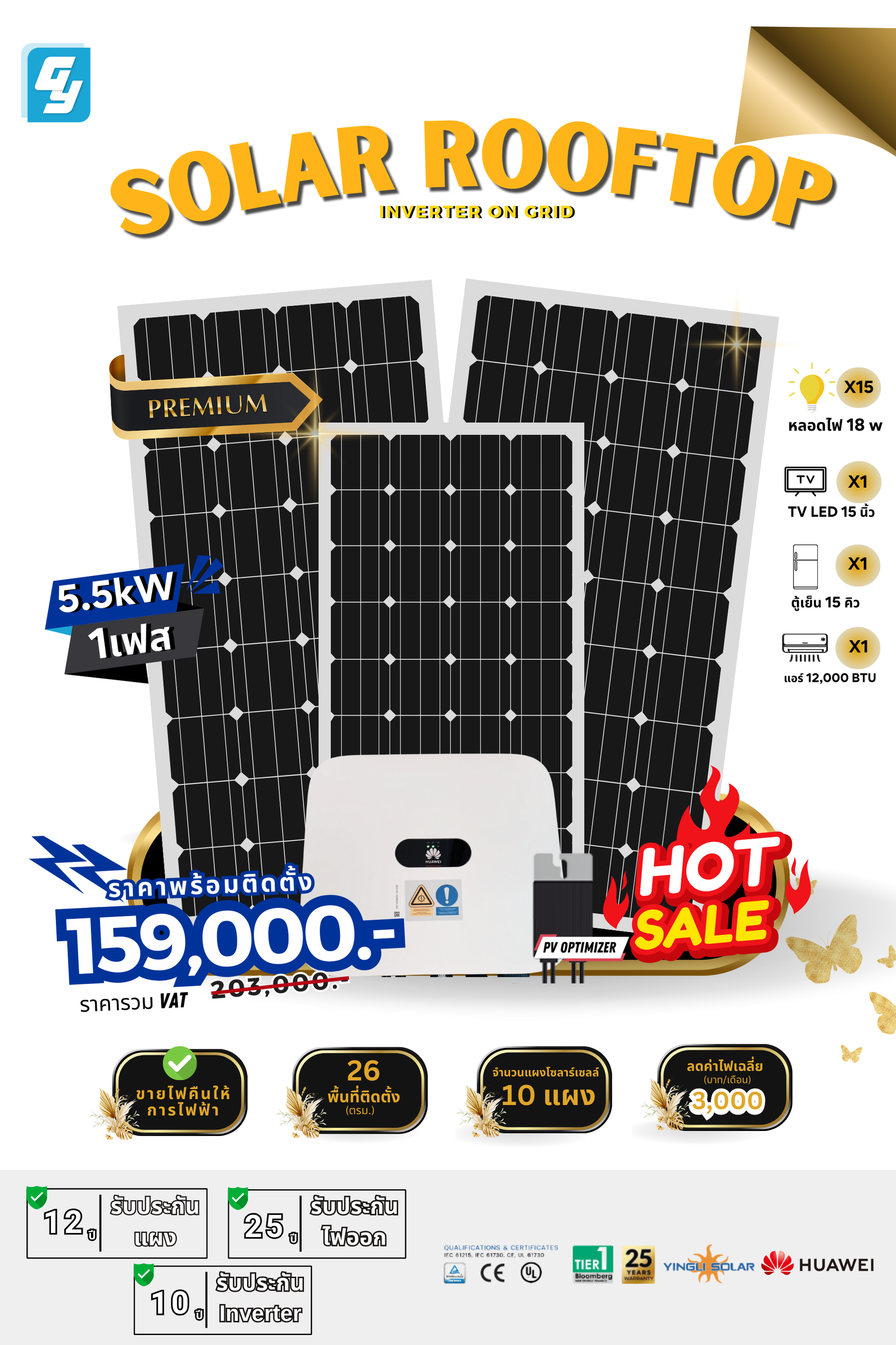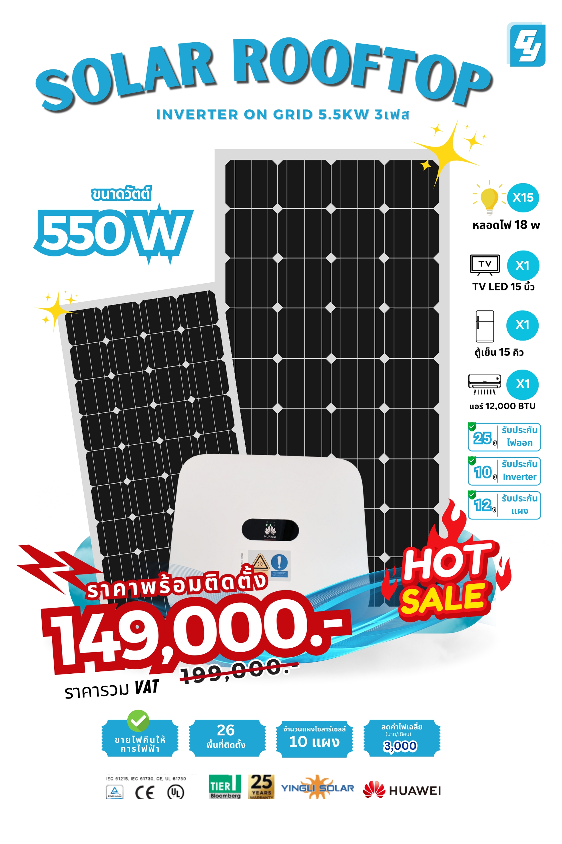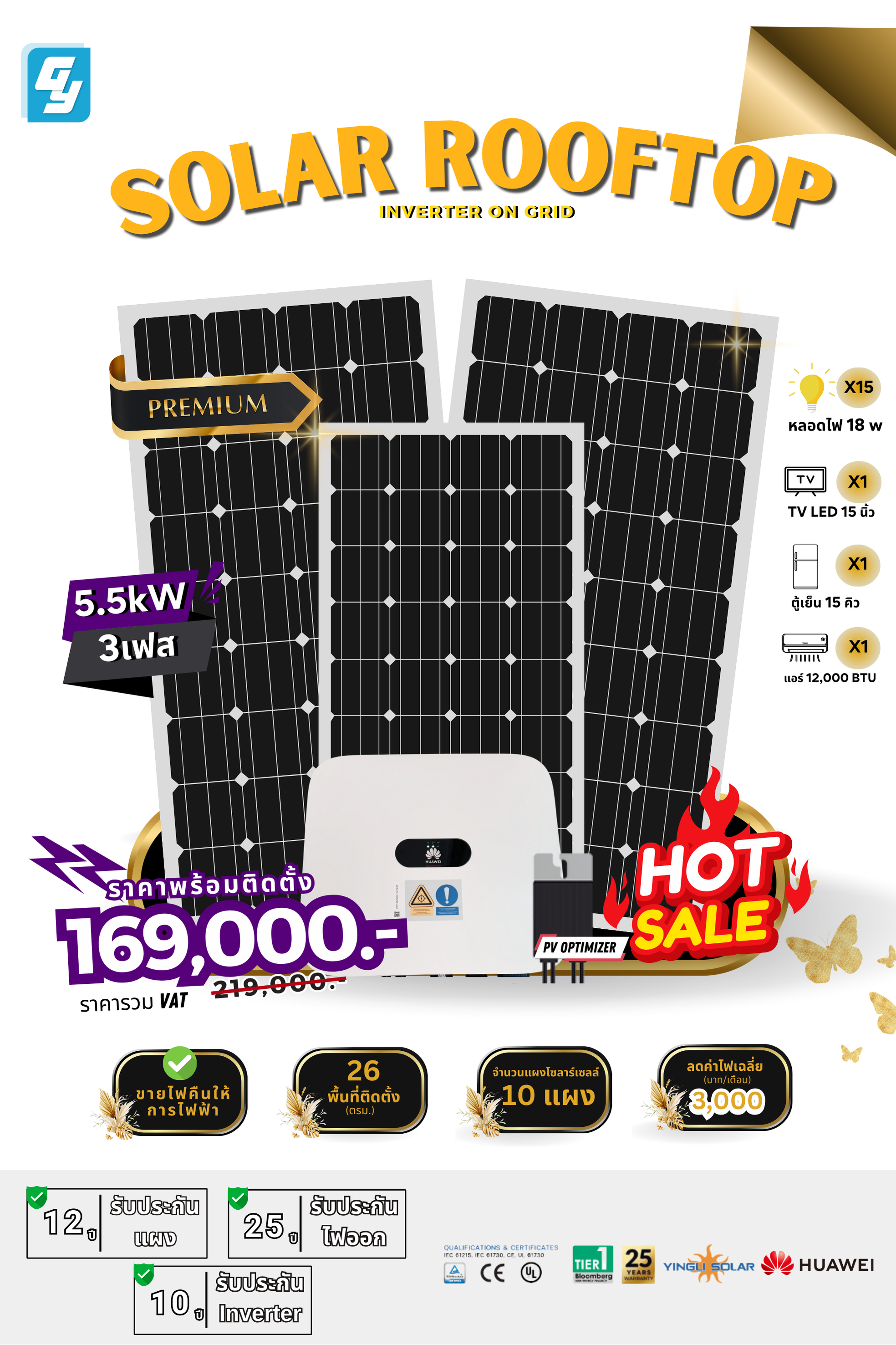 แพคเกจติดตั้งโซลาร์เซลล์ 5.5 kW 1 เฟส P-Type 550w (ราคานี้รวมVat) 139,000 บาท เพิ่มเติม แพคเกจติดตั้งโซลาร์เซลล์ 5.5 kW 3 เฟส P-Type 550w (ราคานี้รวมVat) 149,000 บาท แพคเกจติดตั้งโซลาร์เซลล์ 11 kW 1,3 เฟส P-Type 550w (ราคานี้รวมVat) 229,000 บาท แพคเกจติดตั้งโซลาร์เซลล์ 16.5 kW 3 เฟส P-Type 550w (ราคานี้รวมVat) 339,000 บาท แพคเกจติดตั้งโซลาร์เซลล์ 22 kW 3 เฟส P-Type 550w (ราคานี้รวมVat) 399,000 บาท แพคเกจติดตั้งโซลาร์เซลล์Premium พร้อม PV Optimizer ขนาด 5.5kW 1 เฟส P-Type 550w (ราคานี้รวมVat) 159,000 บาท แพคเกจติดตั้งโซลาร์เซลล์Premium พร้อม PV Optimizer ขนาด 5.5kW 3 เฟส P-Type 550w (ราคานี้รวมVat) 169,000 บาท แพคเกจติดตั้งโซลาร์เซลล์Premium พร้อม PV Optimizer ขนาด 11kW 3 เฟส P-Type 550w (ราคานี้รวมVat) 269,000 บาท แพคเกจติดตั้งโซลาร์เซลล์Premium พร้อม PV Optimizer ขนาด 16.5kW 3 เฟส P-Type 550w (ราคานี้รวมVat) 390,000 บาท แพคเกจติดตั้งโซลาร์เซลล์Premium พร้อม PV Optimizer ขนาด 22kW 3 เฟส P-Type 550w (ราคานี้รวมVat) 465,000 บาท แพคเกจติดตั้งโซลาร์เซลล์ Hybrid Inverter Deye ขนาดติดตั้ง 11kW 3 เฟส P-Type 550w (ราคานี้รวมVat) 339,000บาท ขาย แผงโซลาร์เซลล์ 3.5 บาท/วัตต์ P-Type 550w (ราคานี้ไม่รวมVat) 1,925 บาท แพคเกจโซลาร์เซลล์ชุดติดตั้งด้วยตนเอง P-Type 550w (ราคานี้รวมVat) 85,000 บาท แพคเกจโซลาร์เซลล์ชุดติดตั้งด้วยตนเอง P-Type 550w (ราคานี้รวมVat) 95,000 บาท แพคเกจโซลาร์เซลล์ชุดติดตั้งด้วยตนเอง P-Type 550w (ราคานี้รวมVat) 145,000 บาท