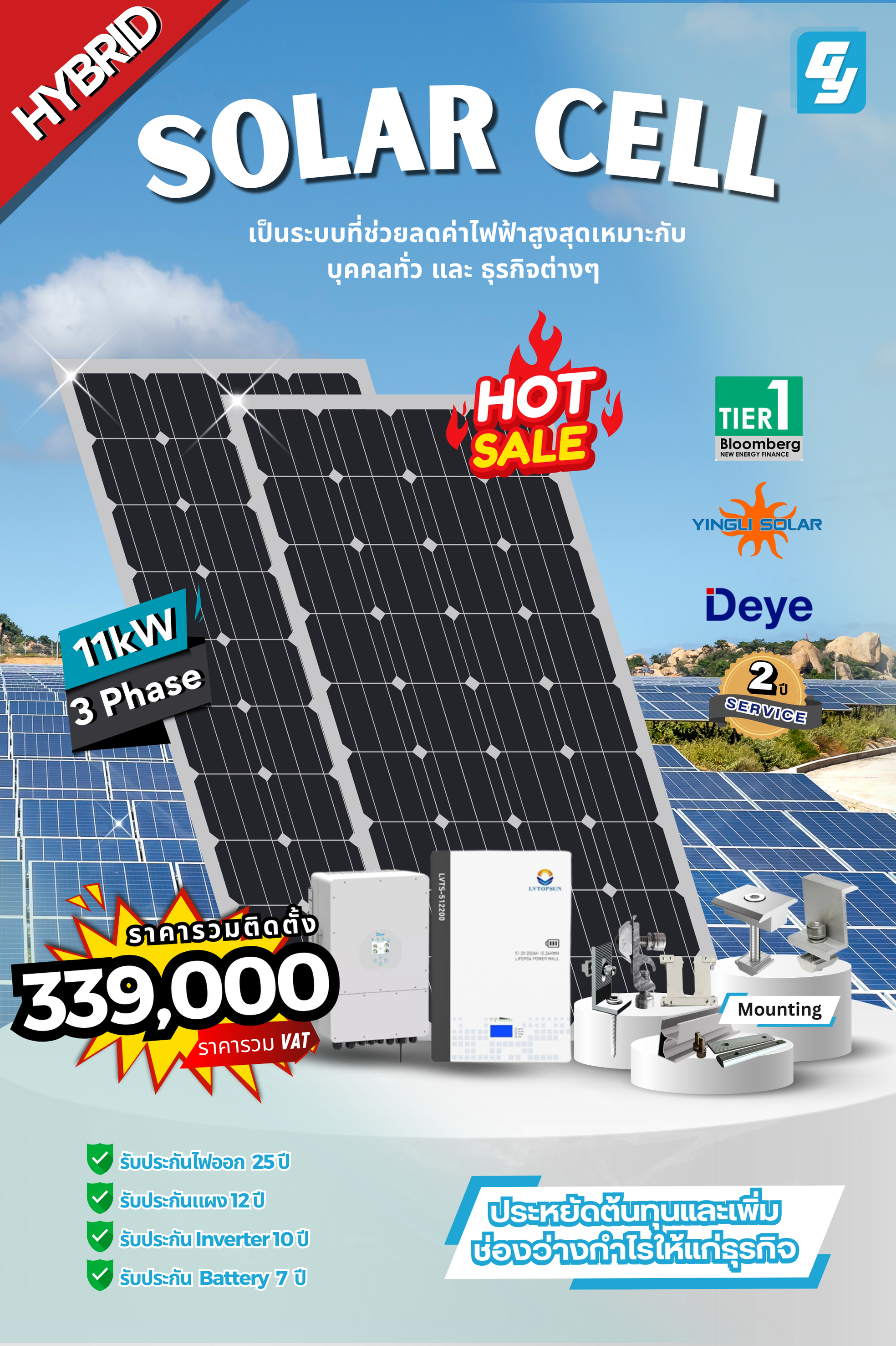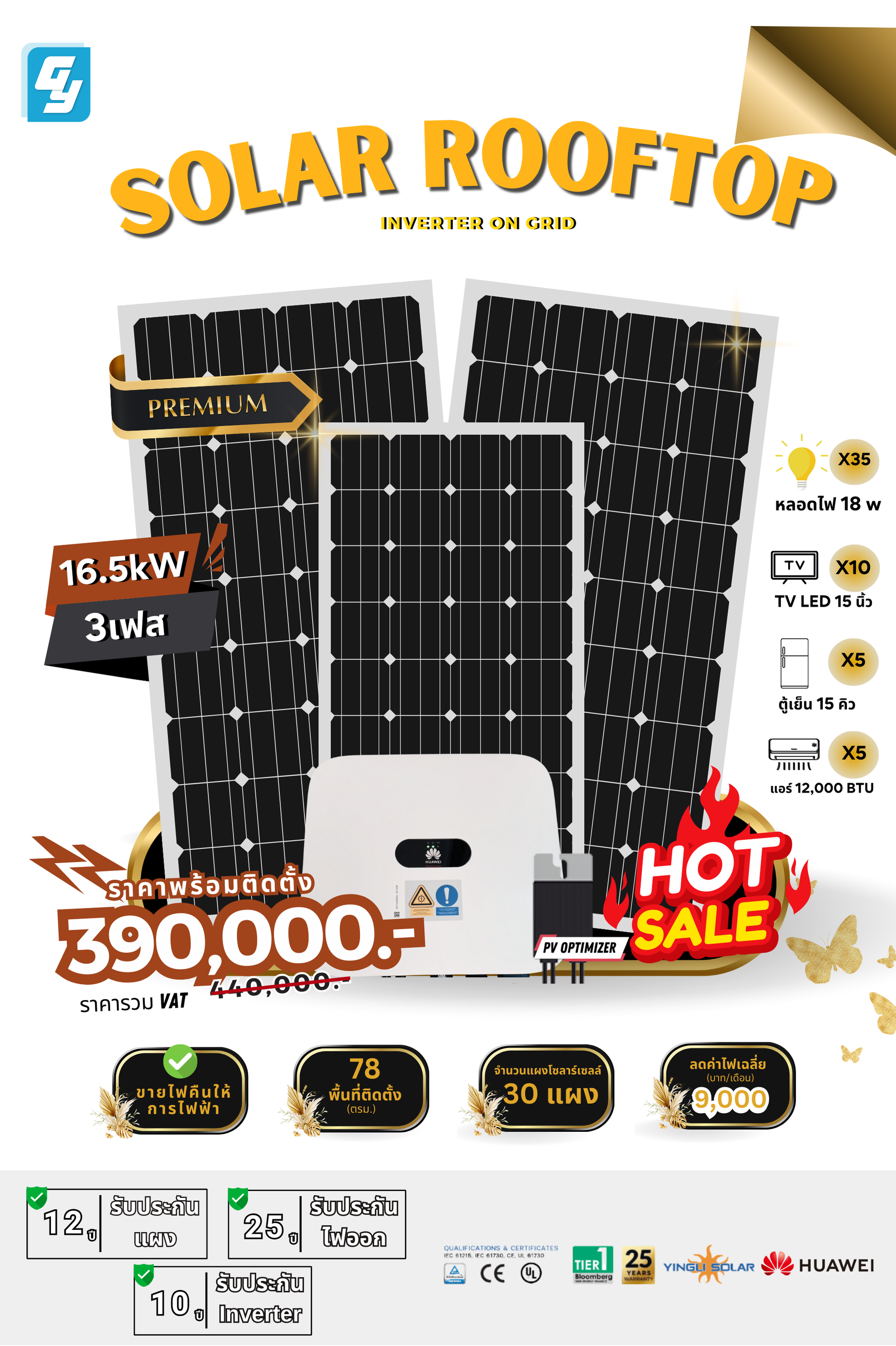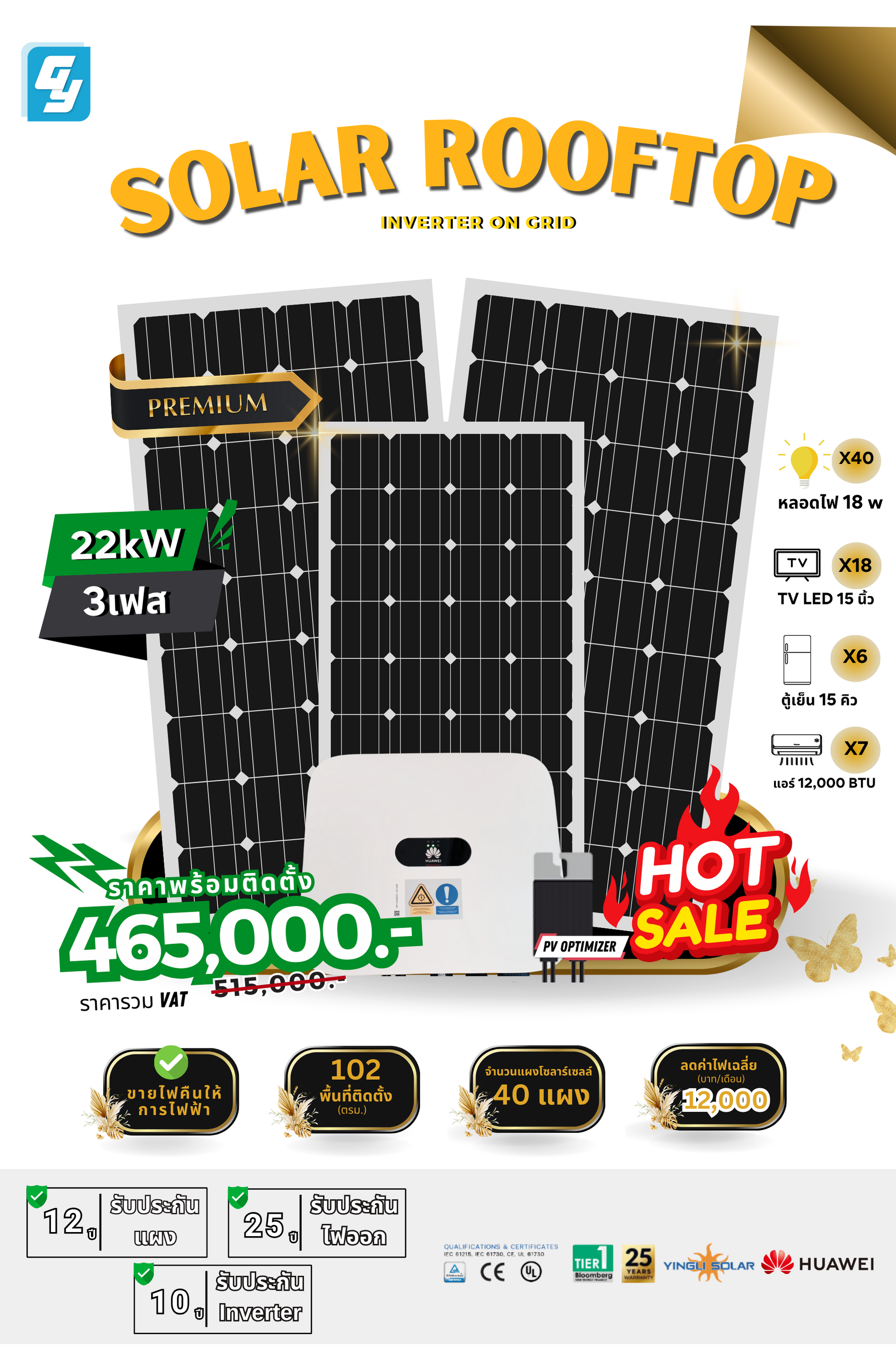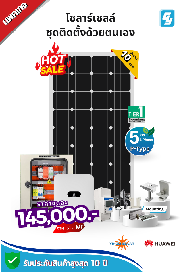แพคเกจติดตั้งโซลาร์เซลล์ 5.5 kW 1 เฟส P-Type 550w (ราคานี้รวมVat) 139,000 บาท เพิ่มเติม แพคเกจติดตั้งโซลาร์เซลล์ 5.5 kW 3 เฟส P-Type 550w (ราคานี้รวมVat) 149,000 บาท แพคเกจติดตั้งโซลาร์เซลล์ 11 kW 1,3 เฟส P-Type 550w (ราคานี้รวมVat) 229,000 บาท แพคเกจติดตั้งโซลาร์เซลล์ 16.5 kW 3 เฟส P-Type 550w (ราคานี้รวมVat) 339,000 บาท แพคเกจติดตั้งโซลาร์เซลล์ 22 kW 3 เฟส P-Type 550w (ราคานี้รวมVat) 399,000 บาท แพคเกจติดตั้งโซลาร์เซลล์Premium พร้อม PV Optimizer ขนาด 5.5kW 1 เฟส P-Type 550w (ราคานี้รวมVat) 159,000 บาท แพคเกจติดตั้งโซลาร์เซลล์Premium พร้อม PV Optimizer ขนาด 5.5kW 3 เฟส P-Type 550w (ราคานี้รวมVat) 169,000 บาท แพคเกจติดตั้งโซลาร์เซลล์Premium พร้อม PV Optimizer ขนาด 11kW 3 เฟส P-Type 550w (ราคานี้รวมVat) 269,000 บาท แพคเกจติดตั้งโซลาร์เซลล์Premium พร้อม PV Optimizer ขนาด 16.5kW 3 เฟส P-Type 550w (ราคานี้รวมVat) 390,000 บาท แพคเกจติดตั้งโซลาร์เซลล์Premium พร้อม PV Optimizer ขนาด 22kW 3 เฟส P-Type 550w (ราคานี้รวมVat) 465,000 บาท แพคเกจติดตั้งโซลาร์เซลล์ Hybrid Inverter Deye ขนาดติดตั้ง 11kW 3 เฟส P-Type 550w (ราคานี้รวมVat) 339,000บาท ขาย แผงโซลาร์เซลล์ 3.5 บาท/วัตต์ P-Type 550w (ราคานี้ไม่รวมVat) 1,925 บาท แพคเกจโซลาร์เซลล์ชุดติดตั้งด้วยตนเอง P-Type 550w (ราคานี้รวมVat) 85,000 บาท แพคเกจโซลาร์เซลล์ชุดติดตั้งด้วยตนเอง P-Type 550w (ราคานี้รวมVat) 95,000 บาท แพคเกจโซลาร์เซลล์ชุดติดตั้งด้วยตนเอง P-Type 550w (ราคานี้รวมVat) 145,000 บาท